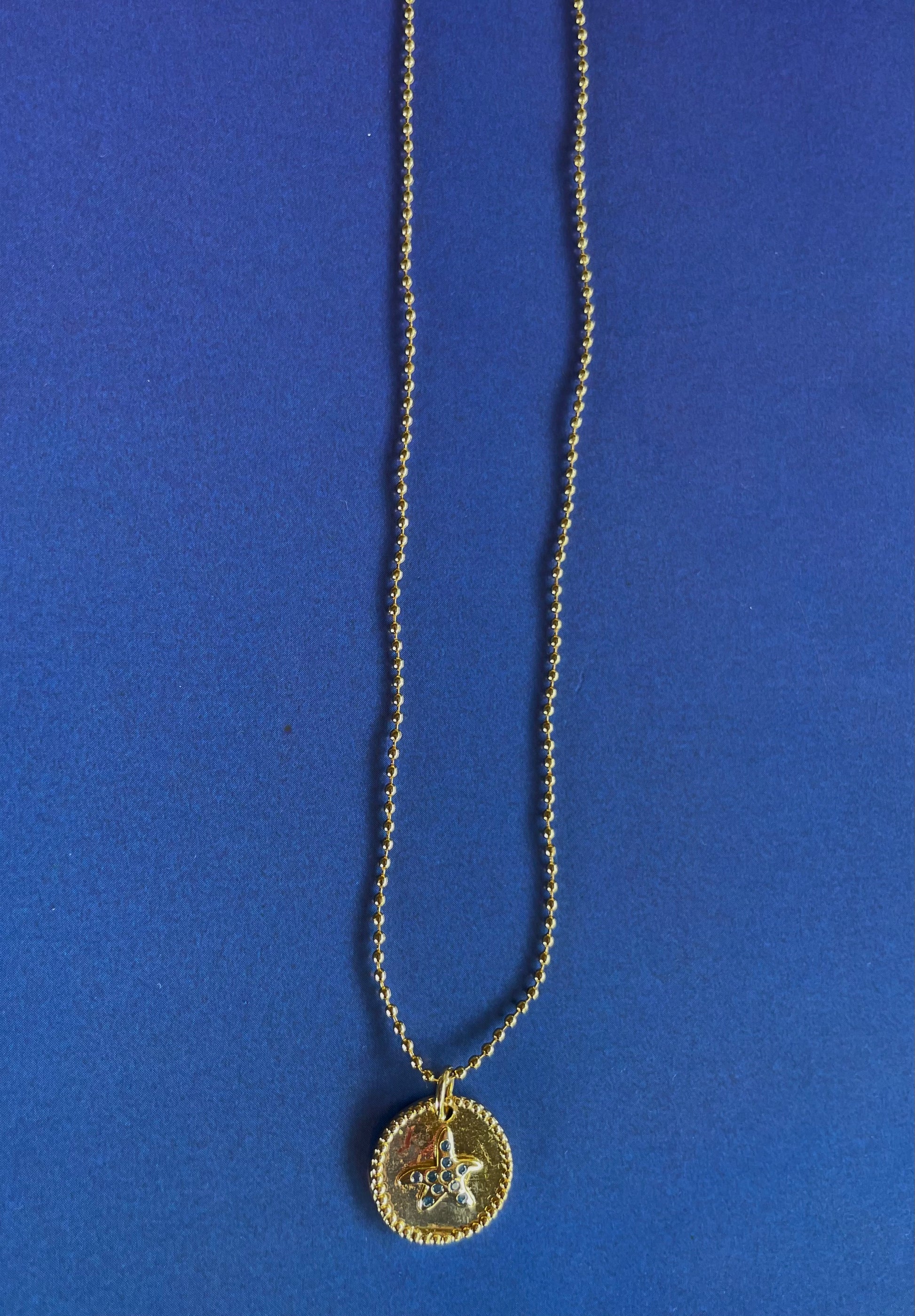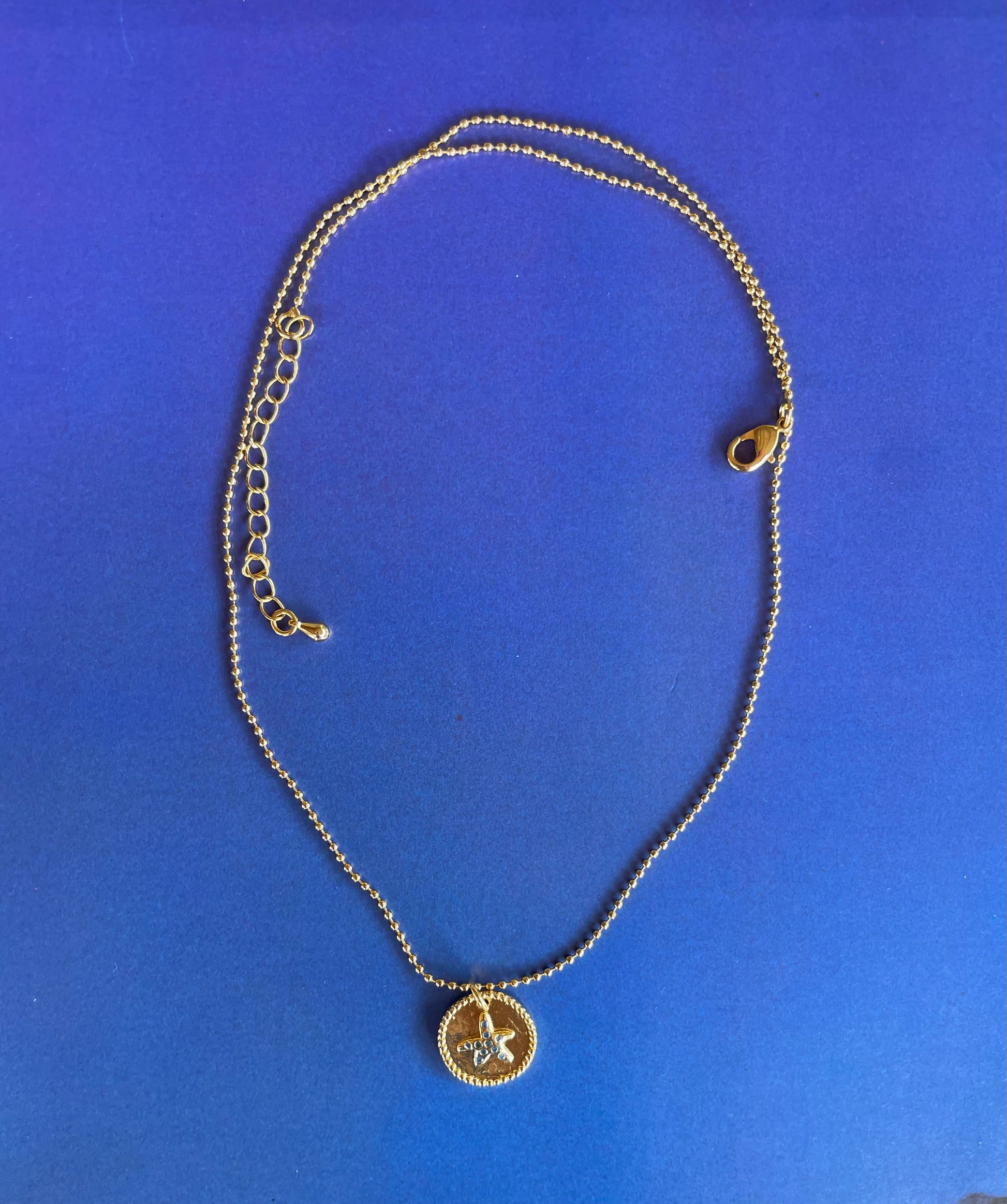 •Starfish coin pendant on an 14K plated 16 inch gold beaded necklace