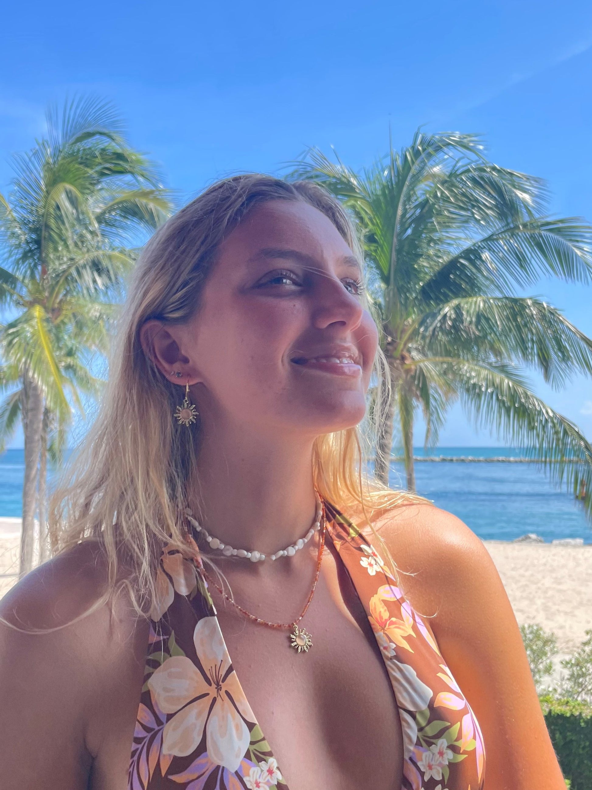 •16 inch bright red, burnt orange, and yellow beaded necklace with a sun charm
